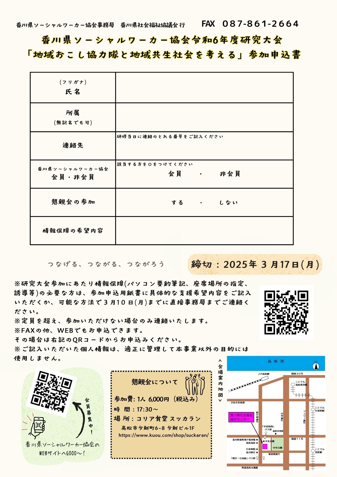 - 2025.3.22(土)13:30~16:30 KASW2024研究大会 地域おこし協力隊と地域共生社会を考える ヒトとまちをつないで地域資源を掘り起こす!(終了)申込フォーム申込書(FAX用)