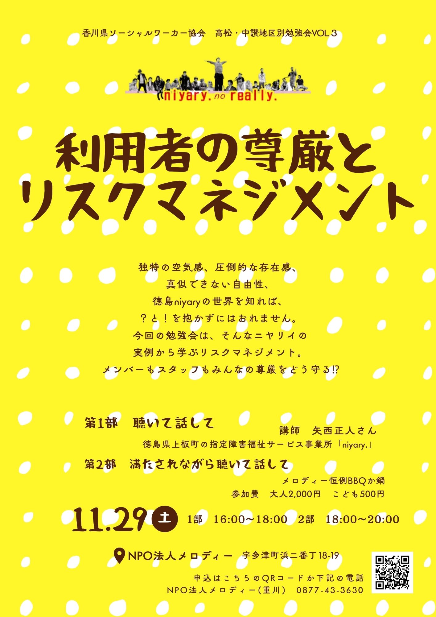 - 2025.11.29(土)第Ⅰ部16:00~18:00 第Ⅱ部18:00~20:00 高松・中讃地区勉強会Vol.3 利用者の尊厳とリスクマネジメント(Ⅰ部) &BBQか鍋交流会(Ⅱ部)(終了)