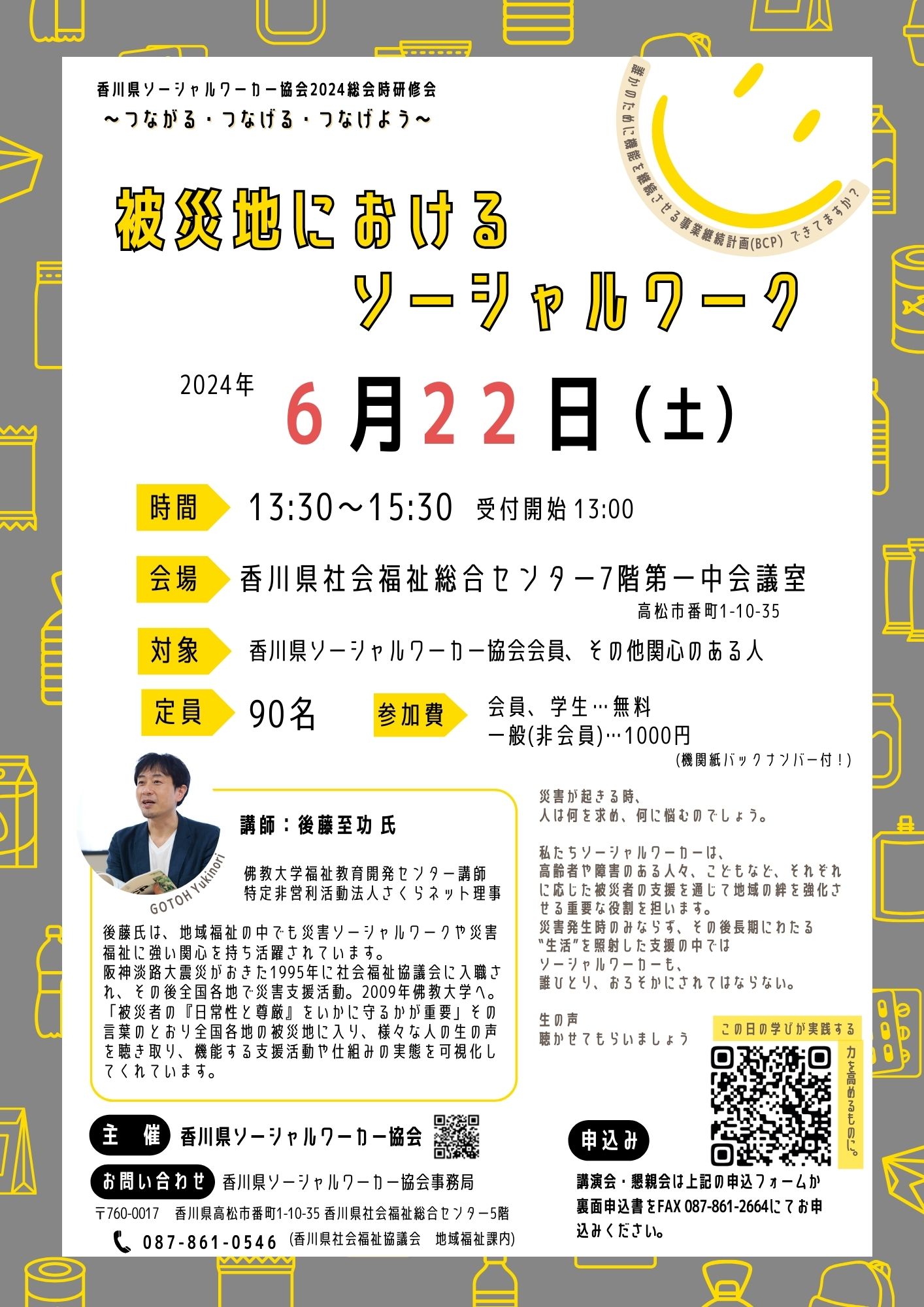 - 2024.6.22(土)13:30~15:30 KASW2024総会時研修「被災地におけるソーシャルワーク」を予定しています。JPG版チラシをごらんください(終了)