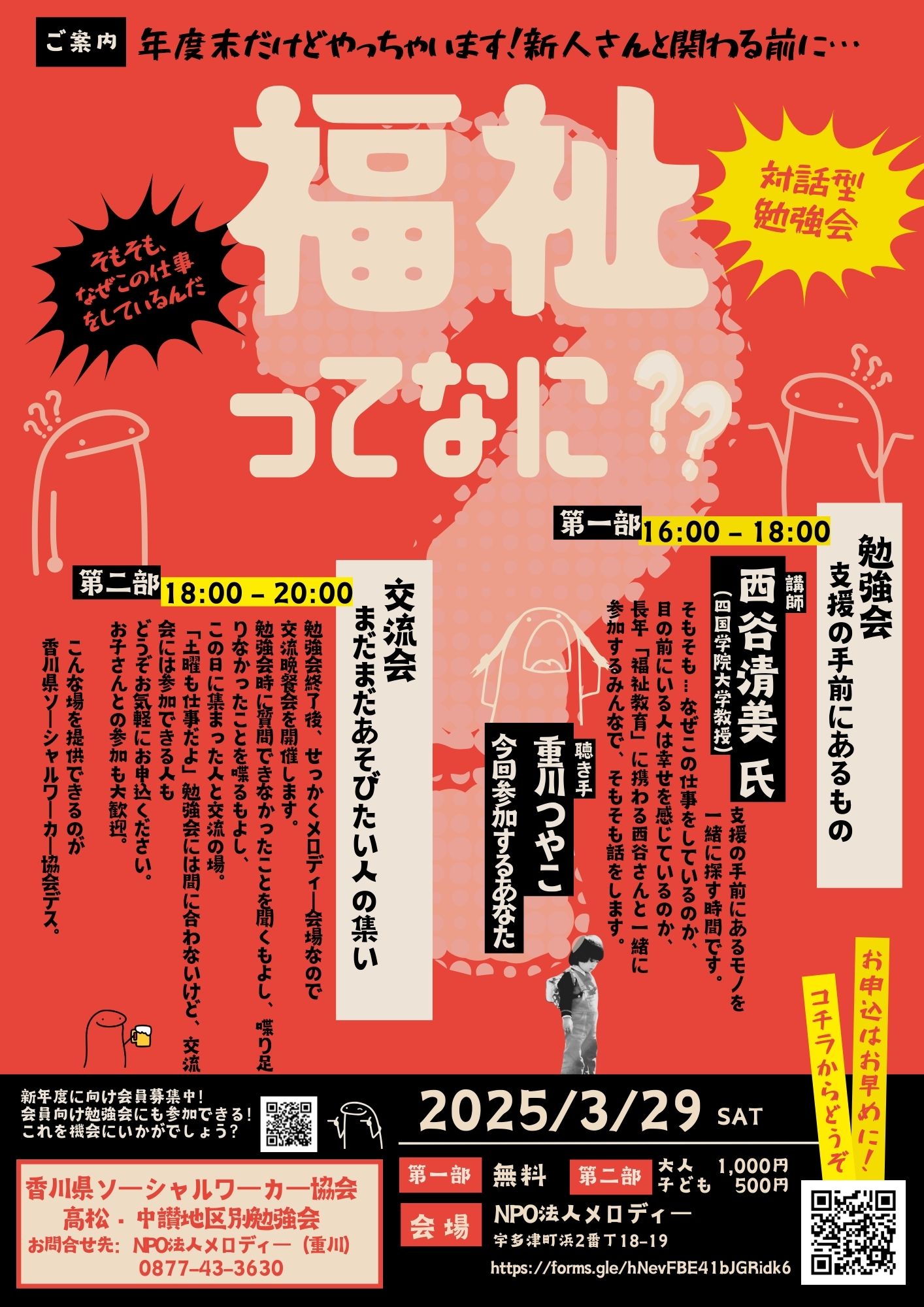 - 2025.3.29(土)第Ⅰ部16:00~18:00 第Ⅱ部18:00~20:00 高松・中讃地区勉強会対話型勉強会 福祉ってなあに??(Ⅰ部) &交流会(Ⅱ部)(終了)